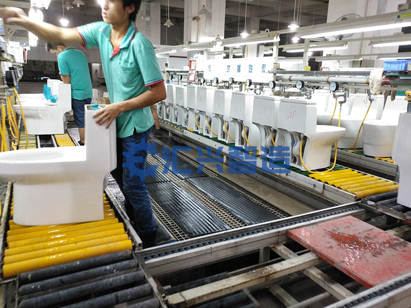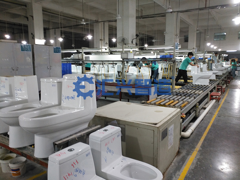 因為連體馬桶比較重,適合選擇做自動組裝線輸送,必須要做單層工裝板或許上下層旋轉(zhuǎn)工裝板。其線體用高強度鋁型材制作,工裝板輸送鏈采用BS30-C212A三倍速鏈條,動力采用變頻調(diào)速,阻擋器采用氣缸自動阻擋。