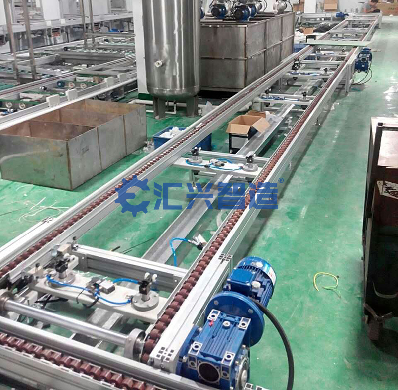 1、鏈式流水線是以鏈條作為牽引和承載體輸送物料,鏈條可以采用普通的套筒滾子輸送鏈,也可采用其它各種特種鏈條;