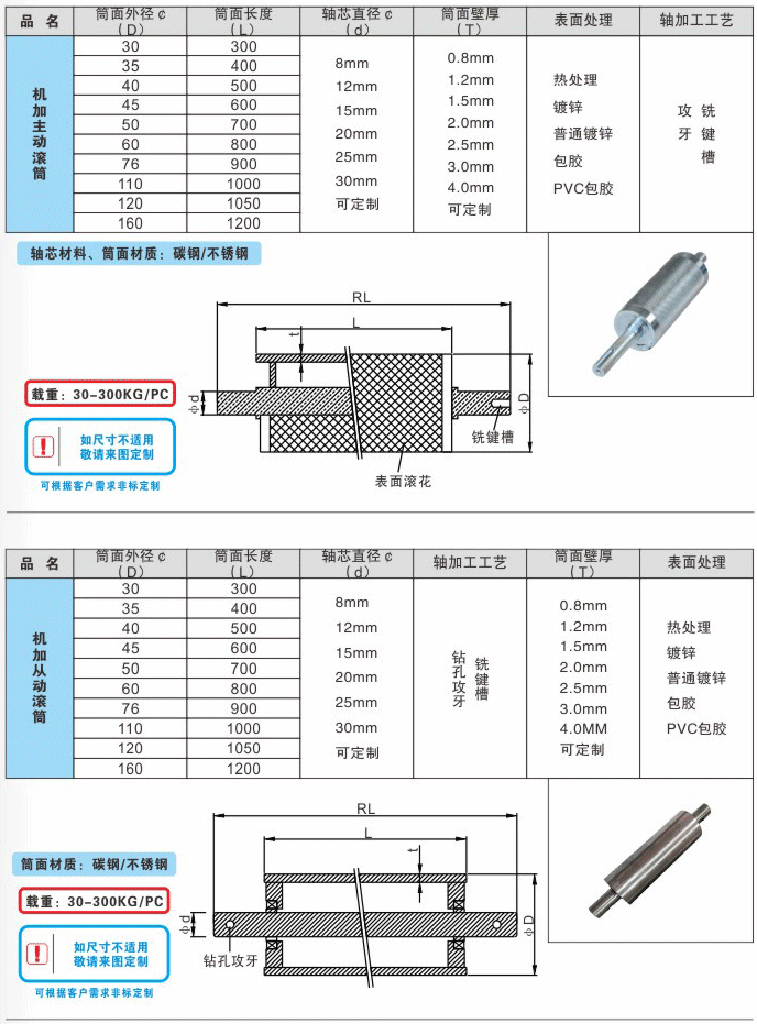根據輸送環境的不同,確定滾筒所采用的材質和表面處理(碳鋼鍍鋅、不銹鋼、發黑還是包膠)。