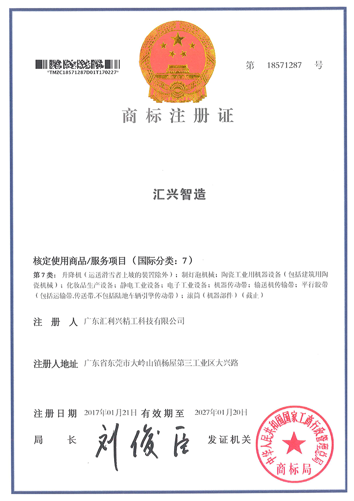 “匯興智造”商標(biāo)注冊證書