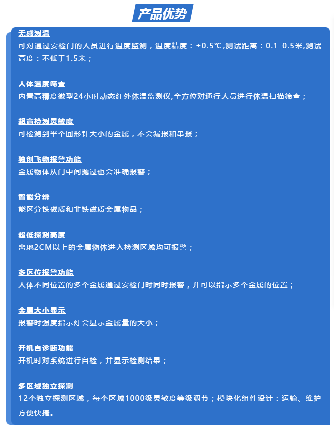 該設備采用世界先進的電磁兼容設計和抗震動設計,具有超高靈敏度、極強的抗干擾能力和抗震能力,適用于管制刀具和槍支等危險物品的安全檢查,廣泛應用于監獄、法院、學校、醫院、電子企業、港口、客運站、展覽會館、會議中心、重大慶典、演唱會等重要場所。