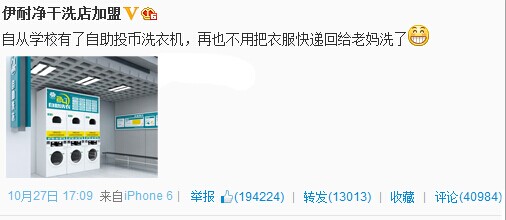 前段時間郵政爆料說很多學生把衣服寄回家洗,惹社會關注。自在洗衣店走進效,學生呼萬歲,伊耐凈發微博稱“自從自助洗衣店走進,再也不用寄衣服回家洗了”。