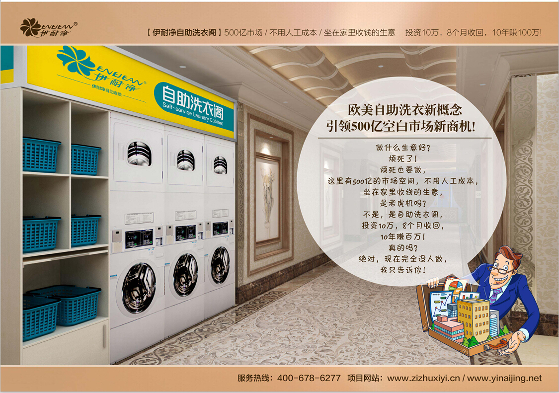 描述:伊耐凈自助洗衣店指一種門為眾群體提供的一種24小時洗滌服務的新型商業模式。無需人工成本,在無店員的情況下,由消費者通過自助投幣或刷卡的方式來洗衣,20分鐘洗衣20分鐘烘干40分鐘洗凈烘干就能穿上。